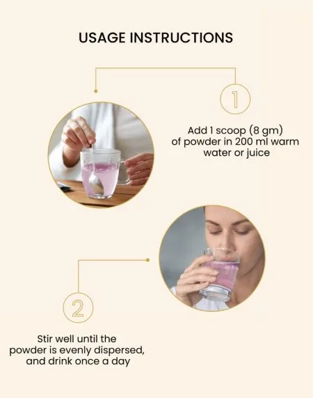 Add 1 scoop (8 gm) of Marham Herbals Collagen Powder to 200 ml of warm water or juice, stir until fully dissolved, and enjoy once daily.